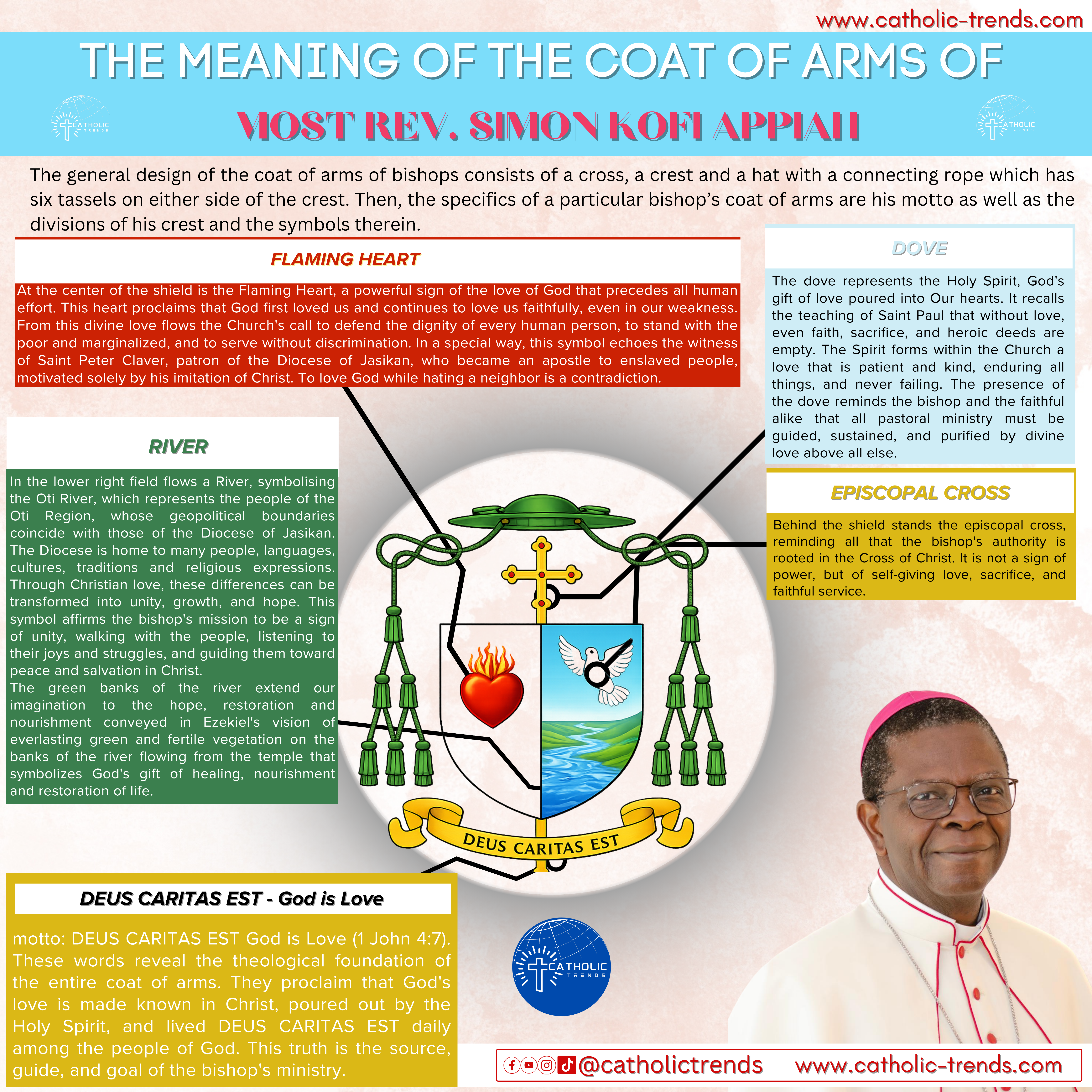 Beneath the shield appears the motto: DEUS CARITAS EST – God is Love (1 John 4:7). These words reveal the theological foundation of the entire coat of arms. They proclaim that God’s love is made known in Christ, poured out by the Holy Spirit, and lived daily among the people of God. This truth is the source, guide, and goal of the bishop’s ministry.